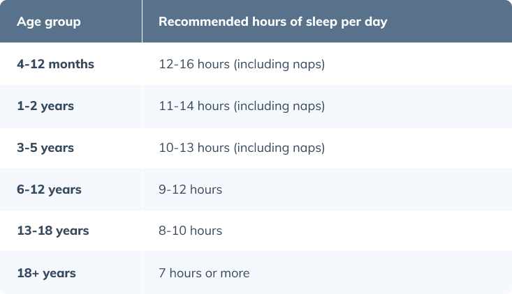The following table summarizes sleep recommendations by population from the American Academy of Sleep Medicine and the Sleep Research Society.