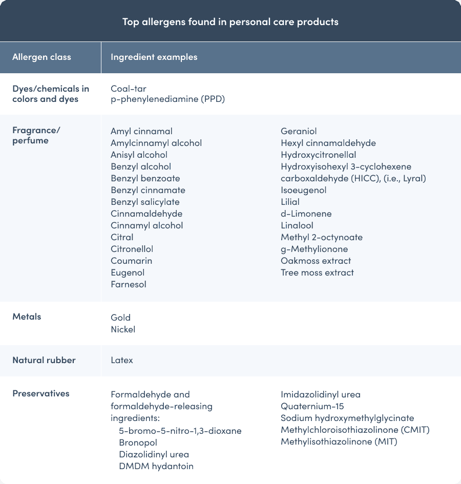An ingredient may appear on the label as the general allergen class it belongs to, for example, “fragrance” or “perfume”, making it difficult to identify. (11) The following table lists allergens associated with allergic reactions from personal care products.