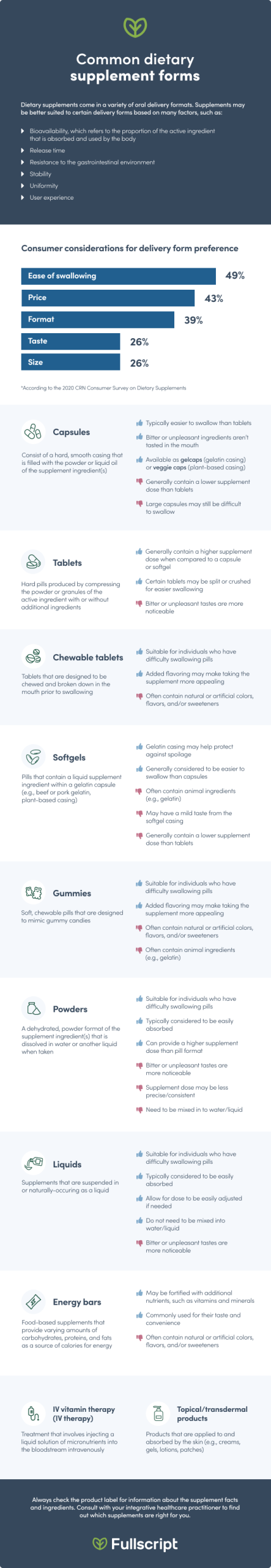 The various forms of dietary supplements each come with their own pros and cons. When selecting dietary supplements, you should consider how these factors will align with your individual preferences, lifestyle, and wellness regimen. Speak to your integrative healthcare practitioner about which dietary supplements and forms are best for you.
