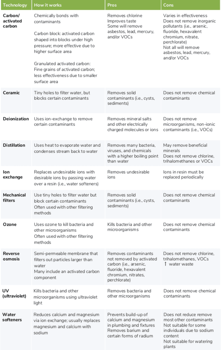 Using a water filter can help remove toxins found in your water, such as fluoride, heavy metals (e.g., mercury, copper, cadmium), pesticides and herbicides, pharmaceutical residues, and volatile organic compounds (VOCs). The following table, based on information from EWG, compares different filtering technologies and how they impact water quality.