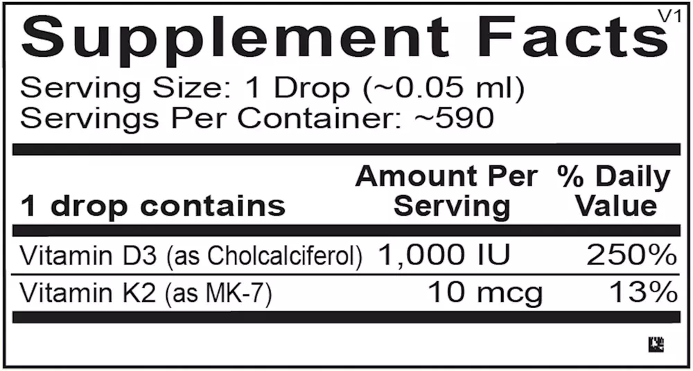 Liquid Vitamin D3 with K2 includes 10 mcg of MenaQ7® PRO, the most widely studied form of vitamin K2 as MK-7, and 1,000 IU of vitamin D3 per serving. The tasteless liquid formula can easily be combined with any beverage.